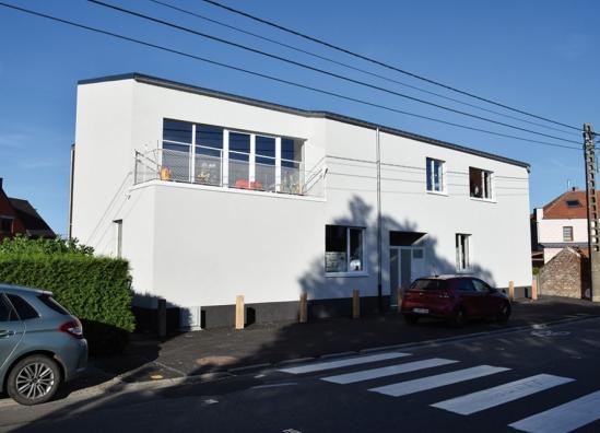 Bâtiment rehaussé en béton cellulaire, ensuite recouvert d’un crépi sur isolant par un partenaire.